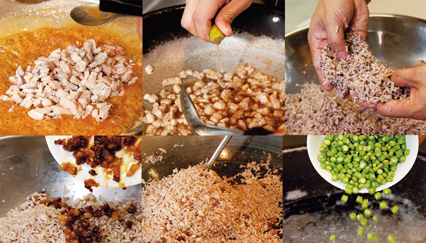 เคล็ดลับคือ ต้องทำตอนกะปิยังร้อน เพราะจะช่วยให้เคล้ากับเมล็ดข้าวได้ง่ายไม่เกาะเป็นก้อนส่วนเรื่องสัดส่วนนั้นให้ชิมเอาค่ะว่าข้าวนั้นมีรสออกเค็มนวล ๆ กลมกล่อมดี เมื่อเคล้าข้าวเสร็จแล้วนำ กุ้งแห้งเนื้อ มา โขลกโยกคลึงในครกหินให้ ฟู แล้วใส่ลงเคล้าในข้าวให้ทั่ว ข้าวจะร่วนดีและเบามือขณะคลุกครานี้ชิมอีกครั้ง ข้าวจะเค็มขึ้นเล็กน้อยเสร็จแล้วพักไว้