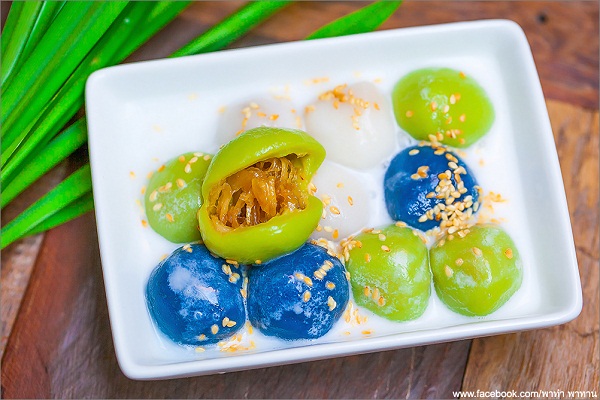 จากนั้นต้มน้ำให้เดือด นำขนมที่ใส่ไส้แล้วลงต้มให้สุกก็จะลอยขึ้นมา จากนั้นตักขึ้นผ่านน้ำเย็น (ป้องกันไม่ให้แป้งติดกัน)
