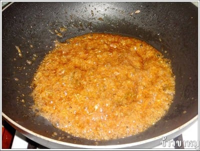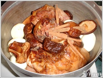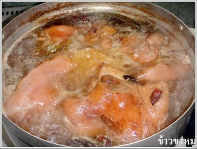 ใช้กระทะใบเดิมตั้งบนเตาใช้ไฟกลาง นำพริกไทย กระเทียม รากผักชี ที่ตำรวมกันลงผัดจนหอม ใส่น้ำตาลมะพร้าวลงผัดจนน้ำตาลละลายและเดือดดี ผัดต่อบนไฟกลางจนน้ำตาลมีสีเข้มๆจนเกือบจะไหม้ ตอนนี้น้ำตาลจะมีกลิ่นที่หอมมากๆ ใส่น้ำปลา ซอสปรุงรส ซีอิ๊วดำหวานนิดหน่อย แล้วปิดไฟ เทใส่หม้อที่เตรียมขาหมูไว้ ใส่ไข่ต้ม เห็ดหอม โป๊ยกั๊ก และอบเชย