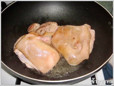 เริ่มจากตั้งกระทะบนเตา เปิดไฟแรง ใส่น้ำมันลงไปเล็กน้อย พอกระทะร้อนดีก็ใส่ขาหมูด้านหนังลงทอดก่อนจนหนังตึง กลับด้านทอดอีกครั้งจนสุกทั่ว แล้วตักใส่หม้อสำหรับตุ๋นเตรียมไว้