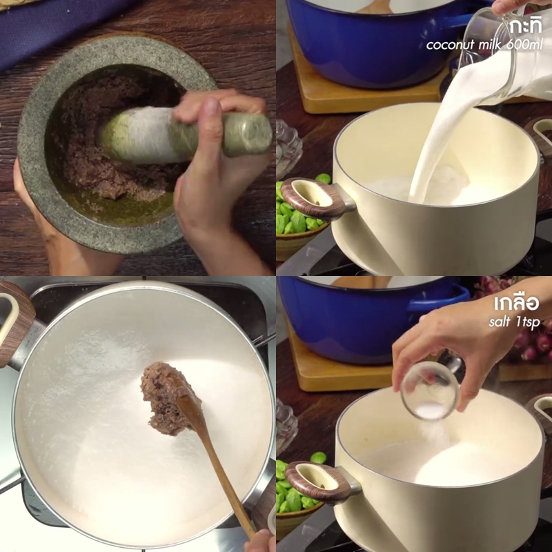 เทน้ำกะทิลงไป เมื่อน้ำกะทิเริ่มเดือด จากนั้นก็นำส่วนผสมที่โขลกลงไปละลาย เพิ่มเกลือให้กลมกล่อมเล็กน้อย