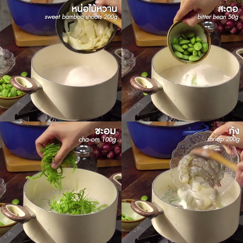 ใส่หน่อไม้หวาน สะตอ ชะอม และกุ้งสดลงไป ต้มจนกว่ากุ้งสุก เสร็จแล้วก็ตักใส่ชามเสิร์ฟ