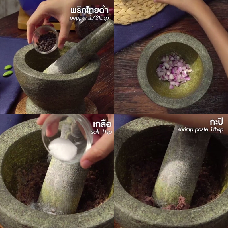 โขลกพริกไทยดำให้ละเอียด ตามด้วยหอมแดง โขลกจนทั้งสองอย่างเข้ากันจากนั้นก็ใส่เกลือและกะปิลงไป โขลกเบาๆ ให้เข้ากัน จากนั้นก็ตักใส่ถ้วยพักไว้