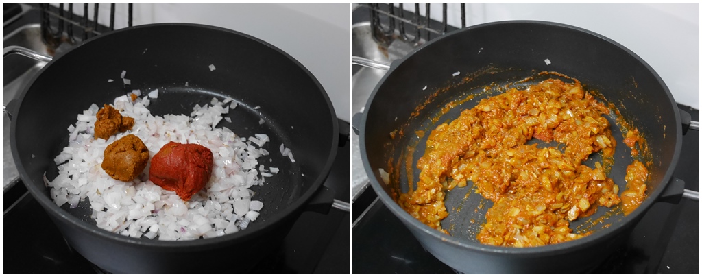 เริ่มจากเอาหอมแขกซอย นำไปผัดจนหอมสุก ใส่ พริกแกงเผ็ดใต้และพริกแกงแดง ผัดให้เข้ากันดี
