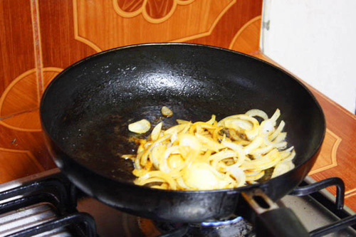 จากนั้นให้ใส่หัวหอมที่หั่นเป็นแว่น ๆ เข้าไปคลุกเคล้าจนเข้ากันดี