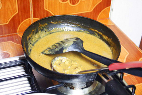 พอเห็ดนิ่มแล้ว ให้เติมน้ำที่ใช้หมักหมูที่เหลือไว้ พร้อมด้วยน้ำสต็อกและเนยเข้าไป เติมรสด้วยเกลือและพริกไทย