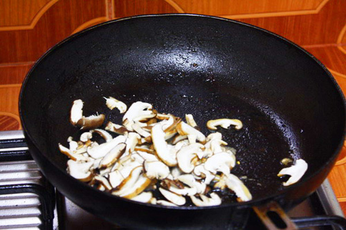 ตามด้วยเห็ดหอมที่หั่นไว้ใส่ลงไป จากนั้นก็ให้ใส่หัวหอมสับลงไป