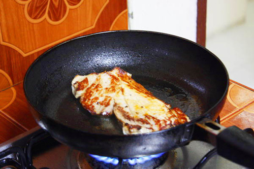 เมื่อมันสุกแล้วก็นำมาหั่นเป็นชิ้น ๆ เสร็จแล้วก็นำใส่ในตู้เย็น เพื่อเตรียมนำมาทอดทานคู่กับสเต๊ก