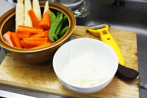 เริ่มนำหัวหอมมาสับให้ละเอียดและหั่นเป็นแว่น ๆ ทิ้งไว้