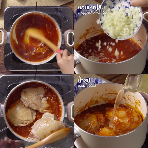 ใส่หอมใหญ่สับ ตามด้วยสะโพกไก่ที่เราทอดไว้ล้ว เทน้ำซุป ตั้งไว้จนซอสซึมเข้าเนื้อสะโพก เสร็จแล้วก็ตักใส่จานเสิร์ฟได้เลยค่ะ
