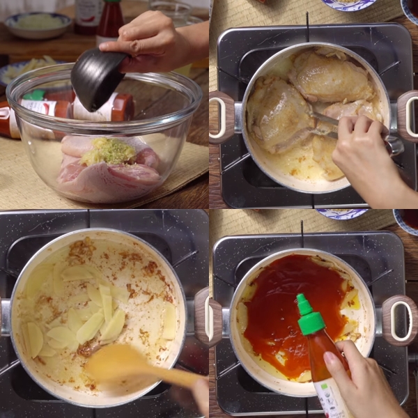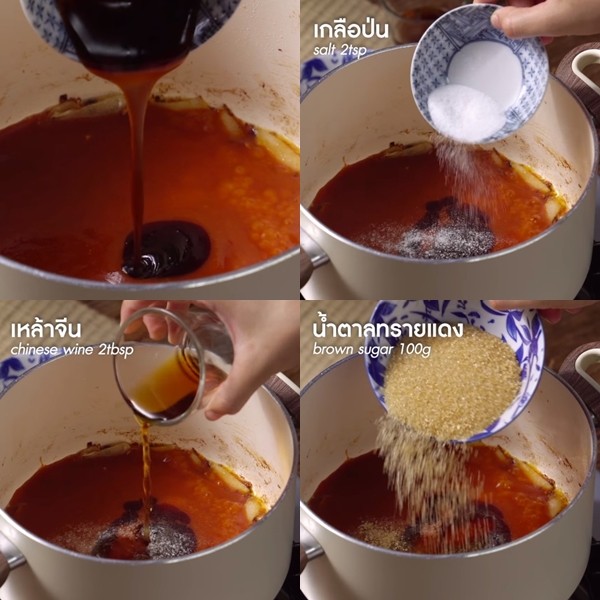 ใส่ขิงลงไปในหม้อที่ทอดไก่ ใส่ซอสพริก ซอสหอยนางรม เกลือป่น เหล้าจีน และน้ำตาลทราย จากนั้นก็คนให้เข้ากัน