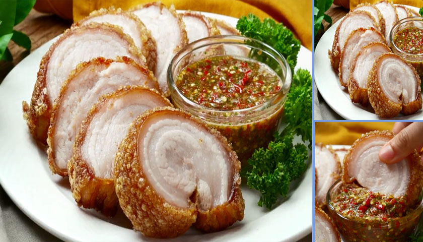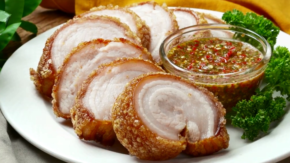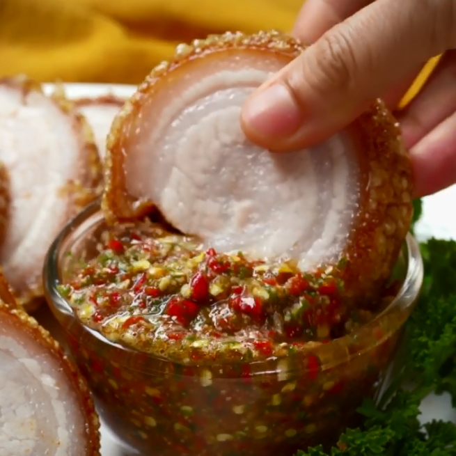 น้ำหมูสามชั้นที่ตากแดดแล้วมาทอดให้หนังกรอบ พอหมูสุกเหลืองแล้วนำขึ้นมา หั่นให้เป็นแว่นๆ เหมือนหมูชาชู