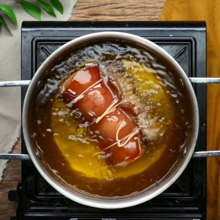 จากนั้นก็นำหมูสามชั้นไปแช่กับน้ำส้มสายชู โดยเอาด้านหนังหมูลงไปหมัก
