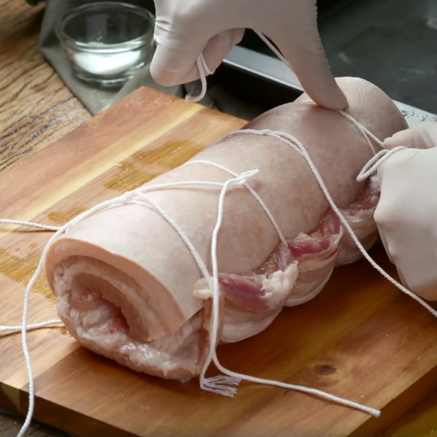 เตรียมเชือกสำหรับมัดหมู ม้วนหมูสามชั้นให้เป็นโรล แล้วมัดเชือกให้แน่น