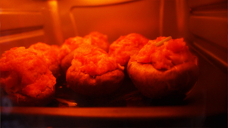 เตรียมหม้อทอดไร้น้ำมัน ใช้ถาดทนความร้อนทาน้ำมันลงไปเล็กน้อย (แนะนำน้ำมันงาหรือน้ำมันมะกอกจะช่วยเพิ่มกลิ่นหอม) จากนั้นนำเห็ดหอมที่ใส่เนื้อหมูลงไป มาวางเรียงบนถาด
