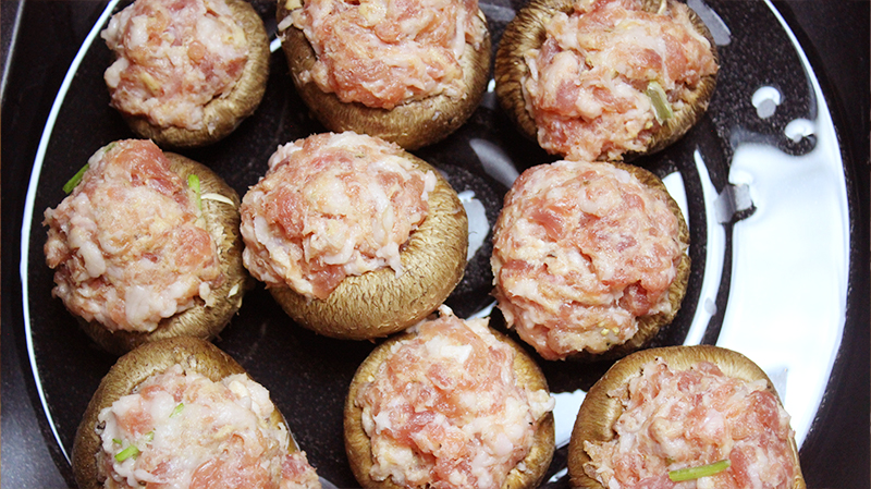 นำเห็ดหอมตัดก้านออก แล้วนำเนื้อหมูปรุงรสที่เตรียมไว้มาปั้นเป็นก้อนเล็กๆ มาแปะลงในเห็ดหอม