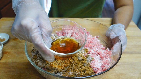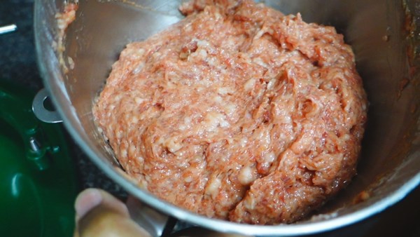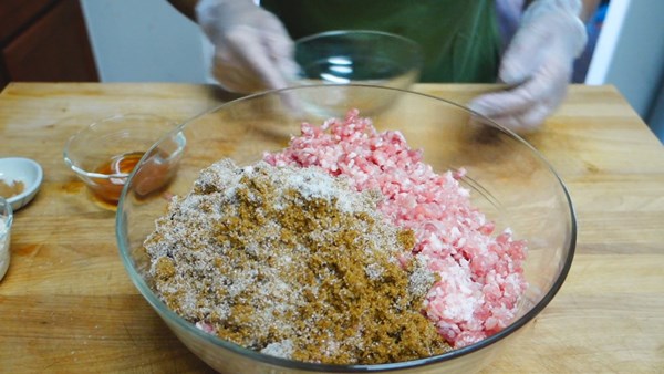 เริ่มจากใช้เนื้อหมูติดมัน 1 กิโลกรัม นะคะ ทำออกมาได้ 9 เส้น เยอะเหมือนกันค่ะ เริ่มด้วยนำหมูบดมาใส่อ่างผสม และเทน้ำตาลทรายแดง
