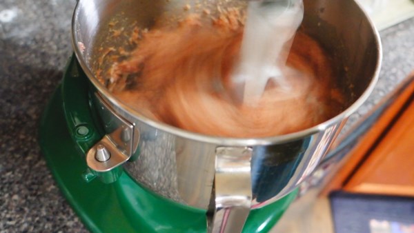 ใส่ส่วนผสมหมดแล้วก็เริ่มคน นวดส่วนผสมให้เข้ากันดี ใช้เครื่องผสม มันเร็วดีค่ะ ใครไม่มี ก็ใช้มือนวด ไปเรื่อย ๆ ซัก 5-10 นาที จนส่วนผสมเข้ากันดีเหนียวนิด ๆ น้ำตาลละลายหมดนะคะ