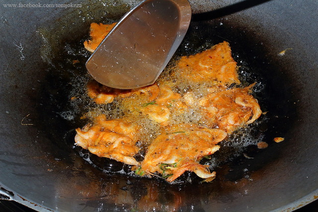 ตั้งกระทะใส่น้ำมันจนร้อน นำลงไปทอดเป็นแผ่นๆ ทอดจนสุกเหลืองหอม