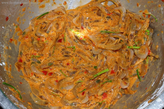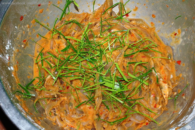 เริ่มจากเตรียมกุ้งฝอย ล้างน้ำให้สะอาดแล้วพักไว้