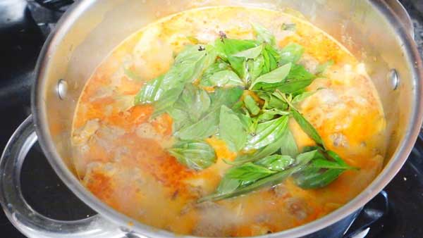 ใส่ใบมะกรูด ฉีกลงไปและใส่ใบโหระพาค่ะ แกงจะหอมขึ้น