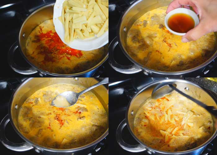 ใส่หน่อไม้ที่หั่นลงไป ปรุงรสด้วยน้ำปลากับน้ำตาลปี๊บ ตั้งไฟให้เดือด ชิมรสตามใจชอบ