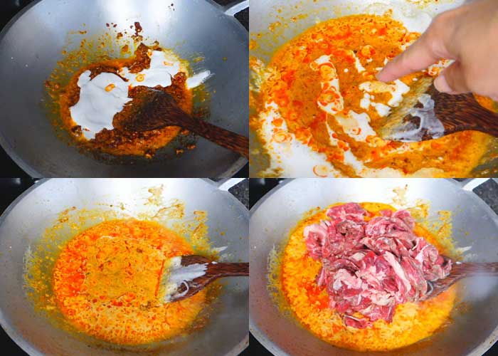 ผัดไปเรื่อย ๆใส่หัวกะทิเรื่อย ๆ ผัดจนกะทิแตกมันดี แล้วก็นำเนื้อติดมันที่เราหั่นพักไว้ลงผัดกับเครื่องแกง