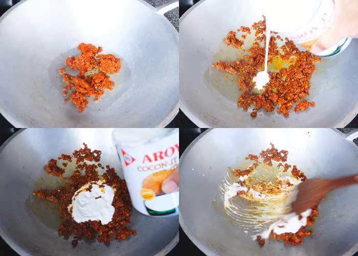 เสร็จแล้วนำน้ำพริกแกงลงผัดกับน้ำมันนิดหน่อย ผัดให้หอม จากนั้นก็ใส่หัวกะทิทีละน้อย ๆ ค่อย ๆ ผัดไปค่ะ