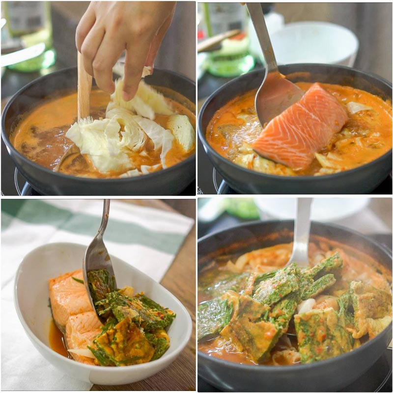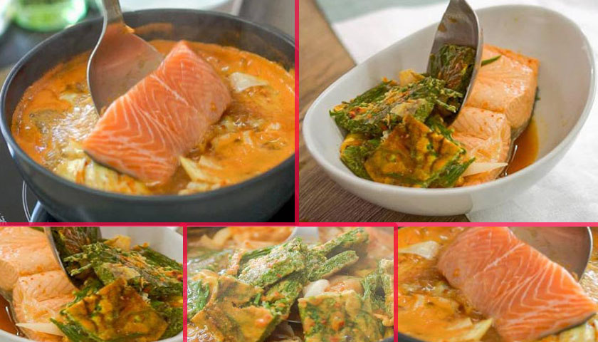 จากนั้นใส่ปลาแซลมอนลงไปในหม้อน้ำพริกแกงที่ต้ม รอให้ปลาสุก อย่าคนเยอะ อาจได้เละได้