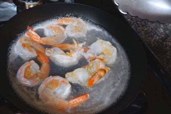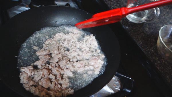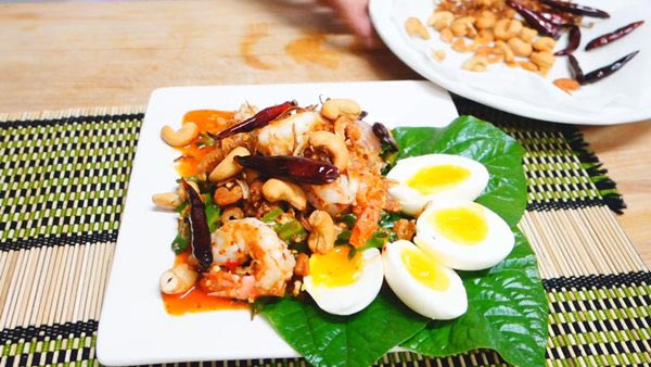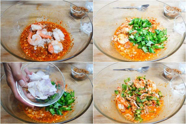 ใส่มะพร้าวคั่วกรอบ ๆ แล้วคนส่วนผสมให้เข้ากันดีแล้วใส่หมูที่รวนไว้และกุ้งลวก แล้วชิมรสชาติตามชอบ
