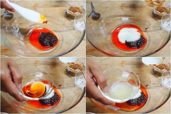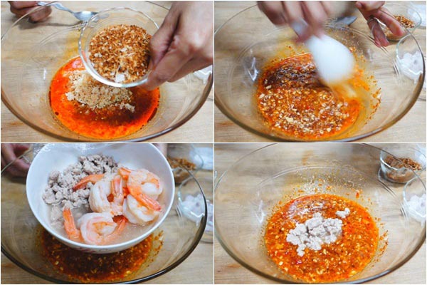 เครื่องทุกอย่างพร้อม มาทำน้ำยำกันค่ะ เริ่มด้วยใส่น้ำพริกเผาลงอ่างผสม