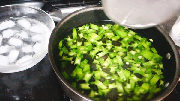ถั่วพู จะหั่นซอยเป็นชิ้นเล็กสัก 2 เซนติเมตร แล้วแต่ชอบนะคะ ใครจะลวกก่อนนำมาหั่นก็ได้ วิธีการลวกให้เตรียมน้ำร้อนจัด น้ำเย็นจัด และเกลือ พอน้ำเดือดใส่เกลือนิดหน่อย แล้วนำถั่วพูลงต้มหรือลวกแล้วแต่จะชอบว่าสุกขนาดไหน แต่แค่แป๊บเดียวจะดีกว่า ถั่วจะได้คงความกรอบ เมื่อได้ที่แล้วนำถั่วพูที่ต้มสุกใส่ในน้ำเย็นจัดทันที เพื่อคงความกรอบและเขียว