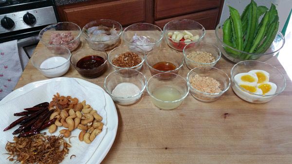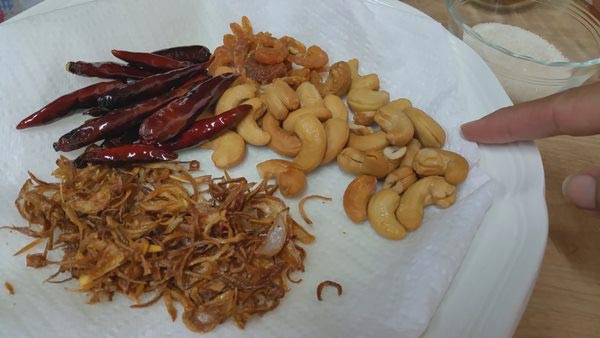 เริ่มจากเตรียมเครื่องทอดกันก่อน ทอดพริกแห้ง กุ้งแห้ง เม็ดมะม่วงหิมพานต์ เจียวหอม และคั่วถั่วลิสงแล้วตำพอหยาบ เตรียมรอไว้