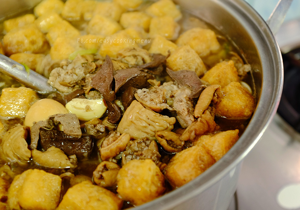 นำเครื่องที่ผัดไว้เทใส่หม้อน้ำซุปที่เตรียมไว้ ตามด้วยเต้าหู้ทอด ชิมรสน้ำซุปปรุงเพิ่มให้พอดีตามใจชอบ (จะไม่ได้ใส่น้ำตาลเลยนะคะ แต่น้ำซุปกลมกล่อม หวานจากน้ำซุปกระดูกและความหอมมันจากน้ำต้มใส้หมู ตั้งไฟเคี่ยวต่อสักชั่วโมง หรือ ครึ่งชั่วโมงก็พอ