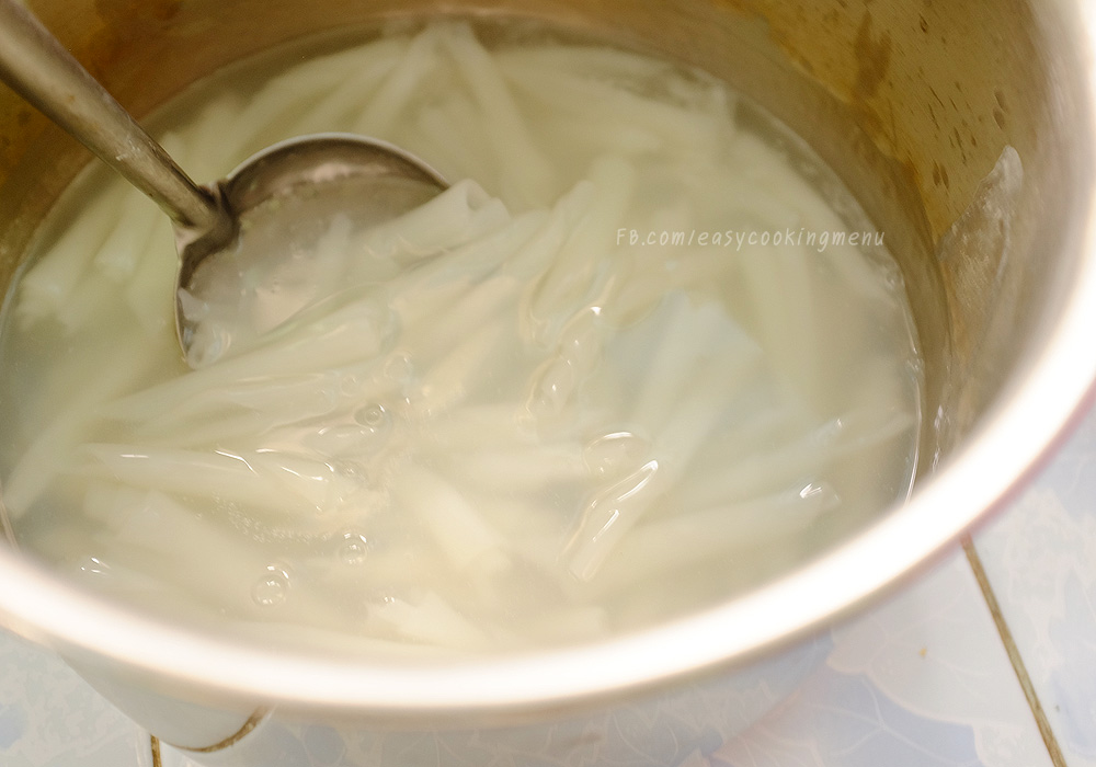 ระหว่างเคี่ยวน้ำซุป มาเตรียมเส้นก๋วยจั๊บกันค่ะ ต้มน้ำให้เดือด ใส่เส้นก๋วยจั๊บลงไป พอม้วนสวย และสุก ใส่แป้งมันหรือแป้งข้าวโพดละลายน้ำ ให้น้ำข้นๆ พักรอไว้ (หากเส้นก๋วยจั๊บไม่ม้วน หรือม้วนไม่สวย ให้ใส่ทีละน้อยๆ แล้วตักออกมาพักใส่ชามไว้ จนได้ปริมาณตามที่ต้องการ แล้วค่อยลงใส่หม้ออีกครั้ง จึงใส่แป้งมันผสมน้ำลงไปให้น้ำข้น)