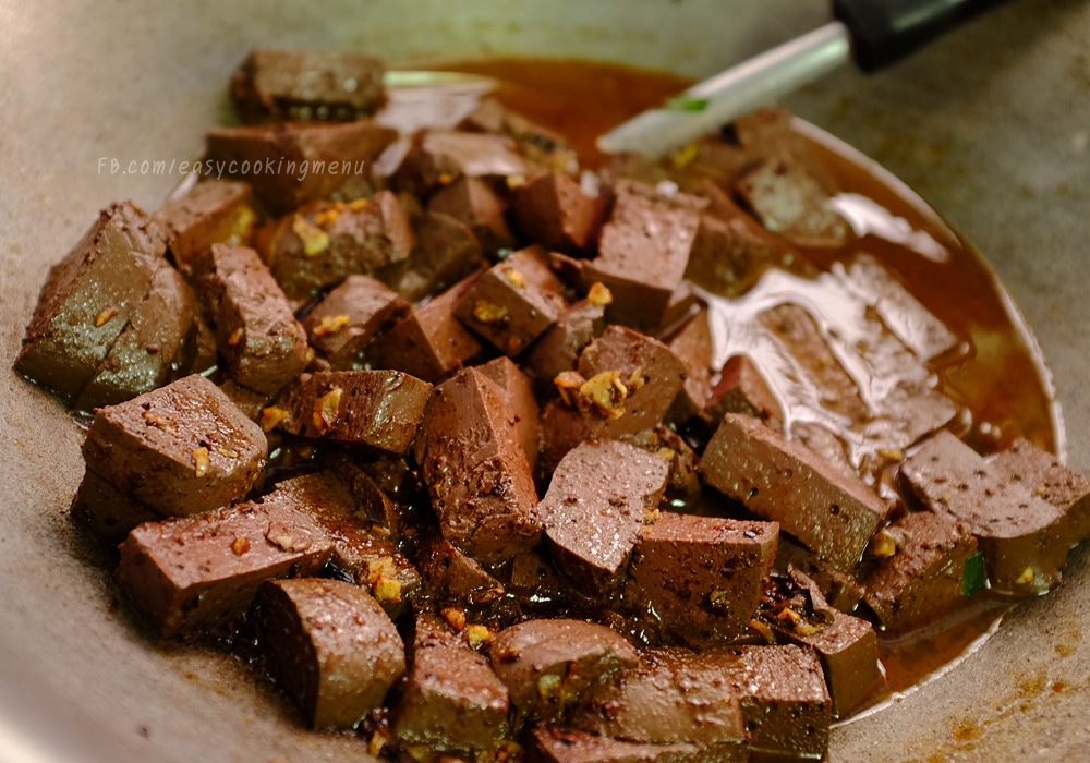 ด้วยวิธีนี้จะทำให้ เลือดไก่ มีรสชาติ ไม่คาวและไม่จืดชืด สักพักนำไข่ไก่ต้มแกะเปลือกแล้ว ลงไปผัดด้วยกันเลย ใส่ซีอิ๊วดำเพิ่มนิดให้สีสวย ใส่ใส้ใหญ่และม้าม ที่หั่นเตรียมไว้ ลงไปผัดเข้ากัน