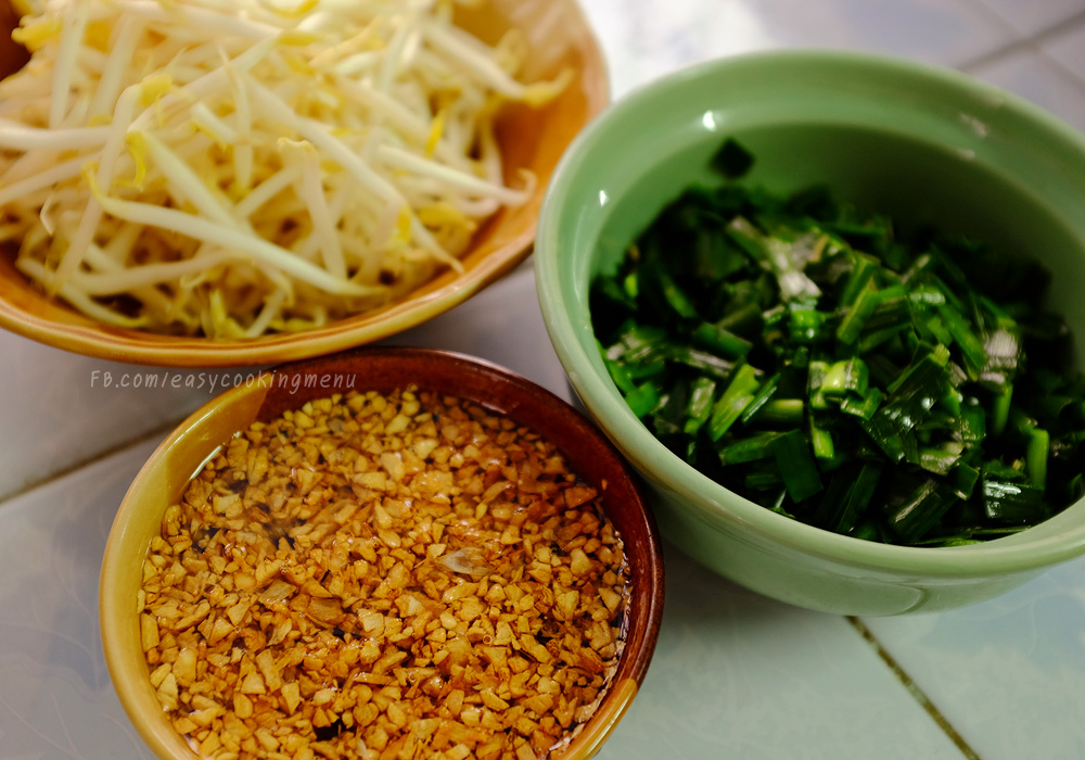 มาเสริฟกันเลยค่ะ ตักเส้นใส่ชามตามด้วยน้ำซุป และเครื่องตามชอบ โรยหน้าด้วย ถั่วงอก กุ้ยช่ายผัด กระเทียมเจียว ไข่ต้มหั่นหรือไม่ตามสะดวกเลยค่ะ