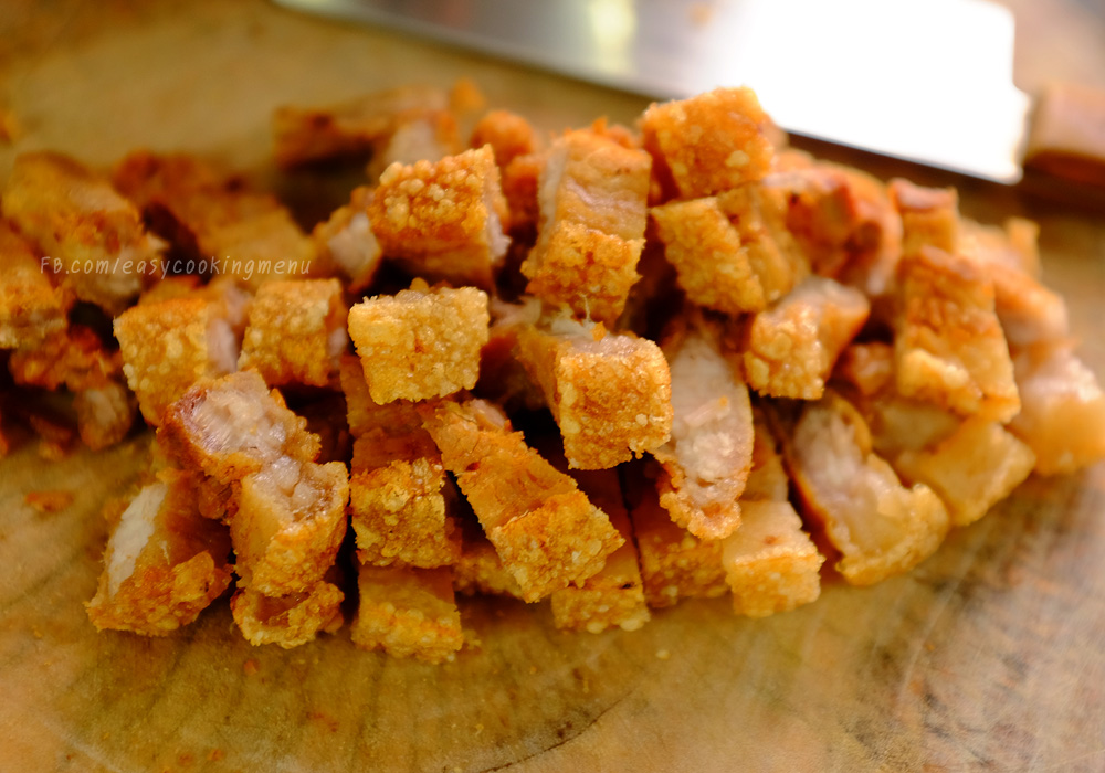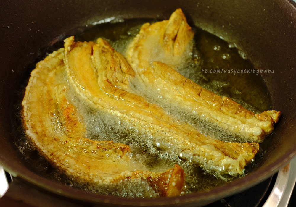 สามชั้นที่อยู่ในหม้อน้ำซุป สุกแล้วตักออกมาค่ะ ทาเกลือนิดหน่อย (เอาไปใส่ในเตาอบ หรือหม้ออบลมร้อนก็ได้ ไฟอ่อนๆ ให้หมูแห้ง) ถ้าไม่มีเอาไปตากแดดแรงๆก็ได้แต่ก็จะช้าหน่อย ไม่งั้นต้มให้สุกแล้วแช่ตู้เย็นไว้ข้ามคืนให้แห้งก็ได้ค่ะ เสร็จแล้วนำไปทอดในน้ำมันร้อนไฟกลาง ก็จะได้หมูกรอบ หั่นเป็นชิ้นๆ พักรอไว้
