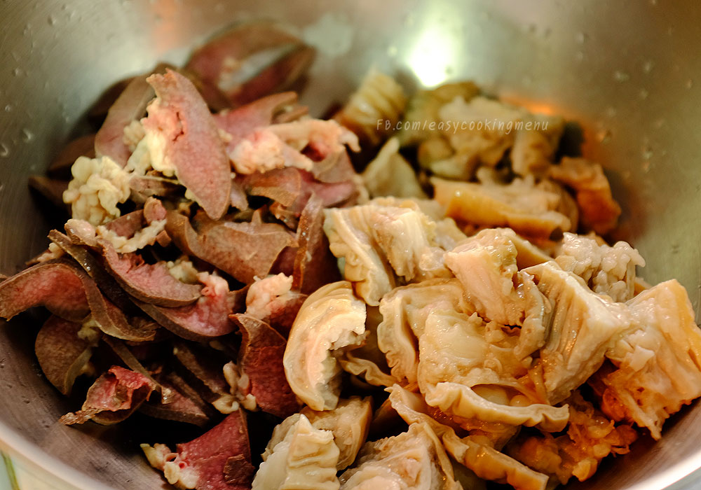 มาทำในส่วนของไส้ใหญ่หมู นำไส้ที่ซื้อมาทาเกลือ และแป้งมัน ล้างกลับอีก สองสามรอบ และนำไปคั่วในกระทะให้กลิ่นไส้จางลงไปอีก จากนั้นต้มให้ไส้เปื่อย สักชั่วโมงกว่าๆ หรือเปื่อยตามใจชอบ นำมาหั่นเป็นชิ้นๆ อีกตัวคือ ม้ามหมู แต่ม้ามไม่ต้องต้มนะคะ