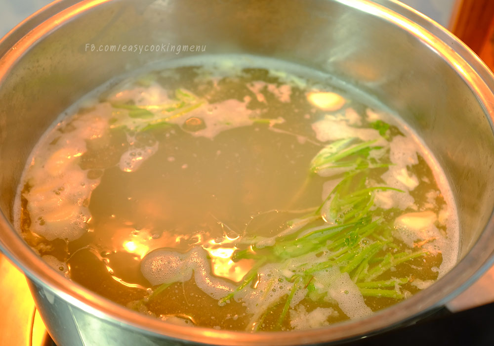 เริ่มจากการต้มน้ำซุป ตั้งน้ำใส่กระเทียม รากผักชี ทุบ ลงไป พอเดือด ใส่กระดูกซุบ เกลือ และหมูสามชั้น ลงไป (หมูสามชั้นสำหรับทำหมูกรอบ)