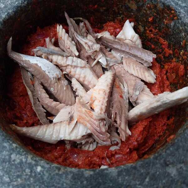โขลกส่วนผสมเครื่องแกงทุกอย่างจนละเอียด ใส่เนื้อปลาลงไปโขลกจนเข้ากันดี