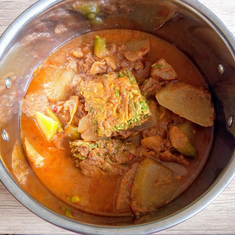 จากนั้นปรุงรสด้วยน้ำปลา น้ำปลาร้า และน้ำตาลมะพร้าว ชิมดู ถ้าเค็มหวานกลมกล่อมแล้ว