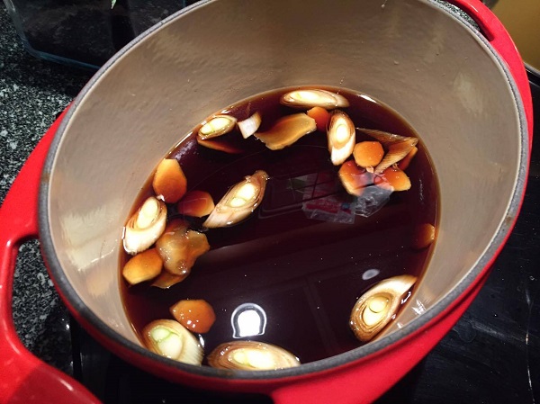 เริ่มจากเตรียมซอสราดข้างบน โดยใส่โชยุ สาเก น้ำดาชิ น้ำตาลทราย และขิงหั่นแว่นลงไปในหม้อ ตั้งไฟอ่อนพอเดือด แล้วพักไว้ค่ะ