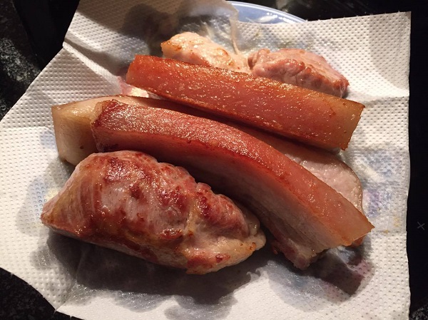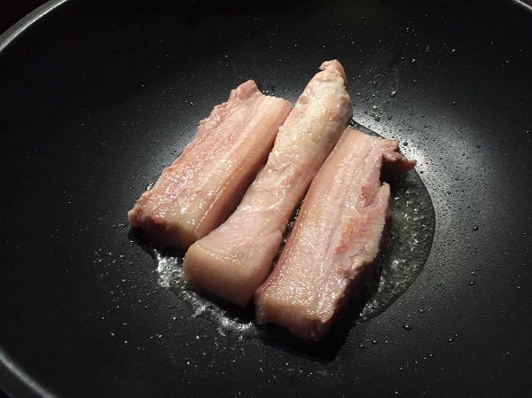 ล้างหมูสามชั้น แล้วพักทิ้งไว้ให้แห้งดี โรยเกลือลงไปคลุกเคล้าให้เข้ากันดีแล้วนำไปจี่ในกระทะให้ทุกด้านสุกนิดหน่อย หนังเกรียมนิด ๆ