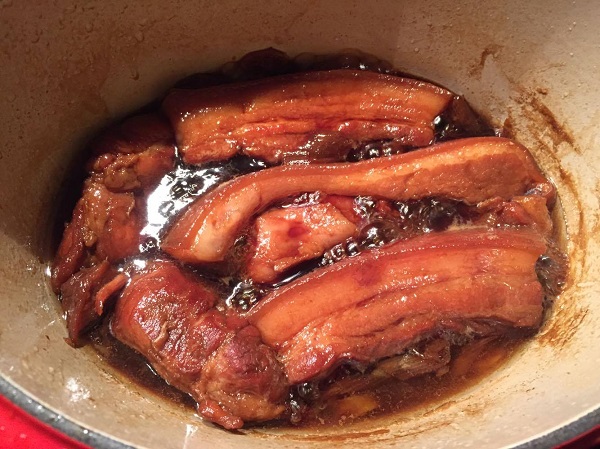 ระหว่างตุ๋นเอาถ้วยหรือชามวางข้างบนเพื่อกดหมูให้จมในน้ำซอสให้หมดนะคะ จะได้ฉ่ำ ๆ ตุ๋นไฟอ่อนไปเรื่อย ๆ เลย ไม่ต้องรีบ สักประมาณ 1.35 ชั่วโมง จนน้ำซอสงวดไปเยอะ เหลือไว้แค่พอขลุกขลิกไว้ราดข้าว ชิมดูจะหอม เค็ม หวาน ตามนี้คะ