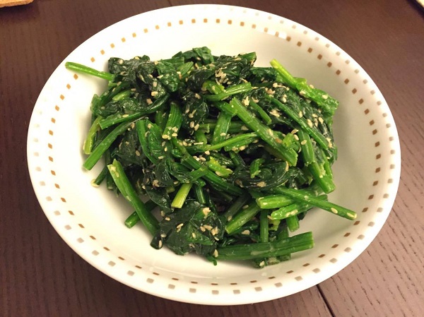 กินกับซุปมิโซะ แล้วก็ผักแนมเป็นปวยเล้งลวกคลุกงา และใส่ซอสงานิดหน่อย และดาชิค่ะ
