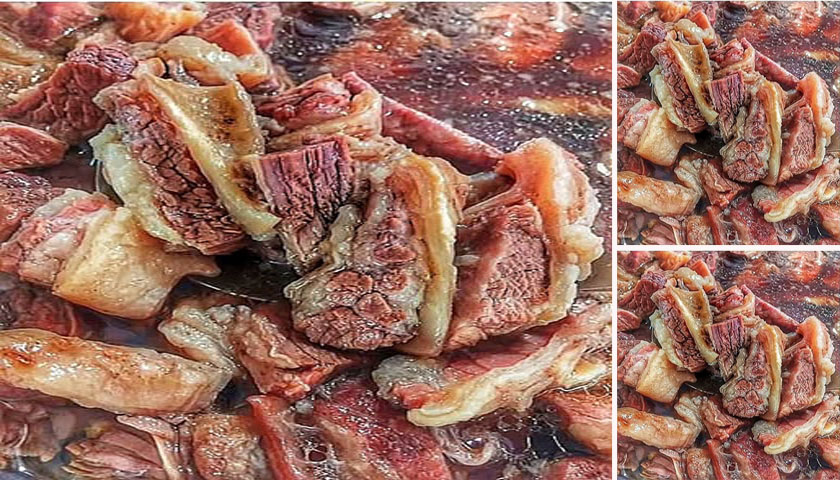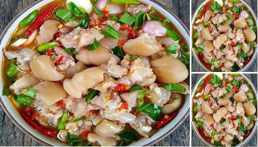 เมื่อหมูสุกได้ที่แล้วนำหมูขึ้นพักในกระชอนรอให้สะเด็ดน้ำมัน