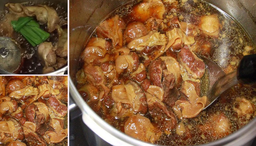 ใส่เครื่องยาจีนลงไป เกลือ ซีอิ๊วดำ นิดหน่อยกะเอาให้สีสวยพอดี