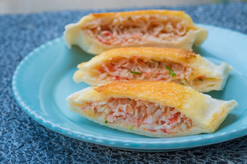 ตักส่วนผสมไส้วางลงตรงกลางของขนมปังได้เลย ประกบด้วยขนมปังอีกแผ่น แล้วหั่นครึ่งตรงกลางอย่างสวยงาม