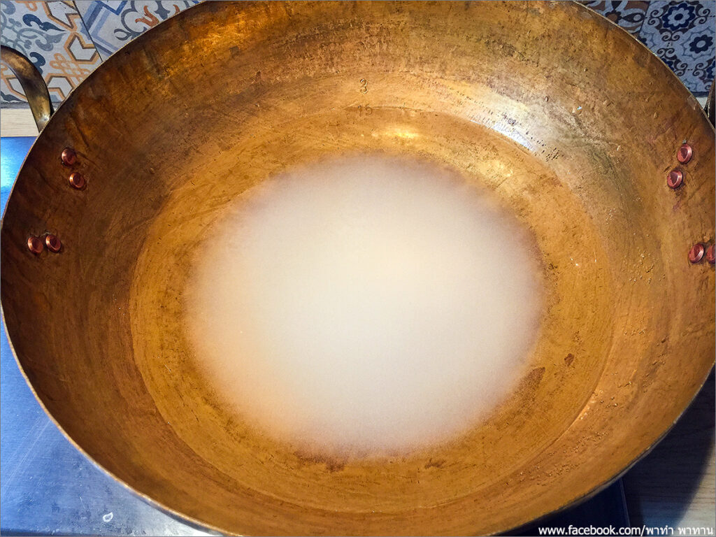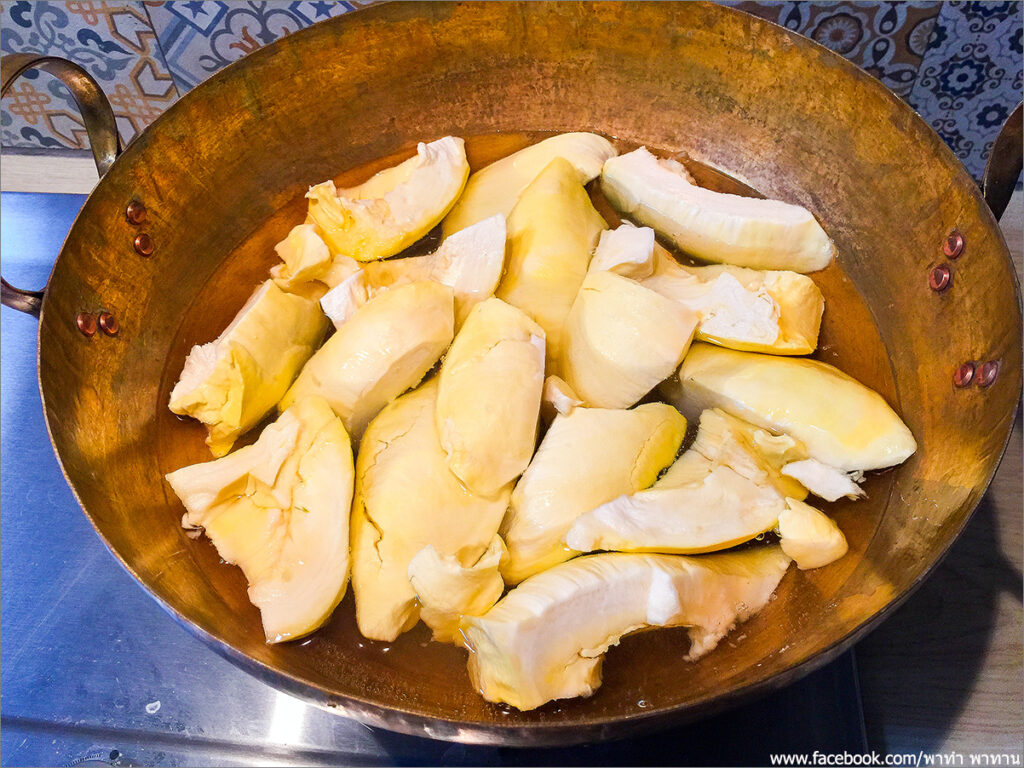 จากนั้นเปิดไฟและเคี่ยวไปซักพักให้เดือด และค่อยใส่เนื้อทุเรียนลงไปค่ะ